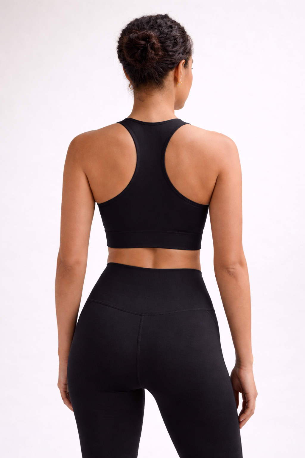 A streamlined performance sports bra designed for yoga, training, and activewear programs.
